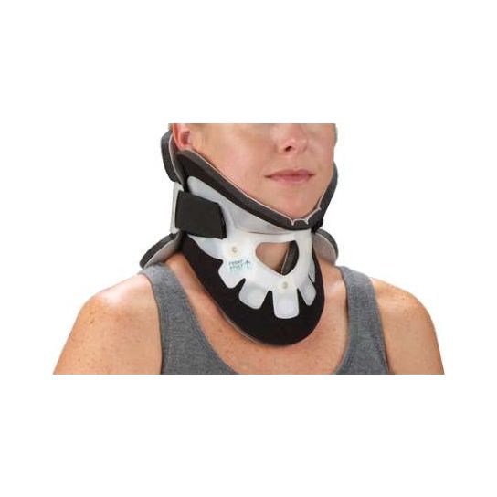 DeRoyal XTW Cervical Collar restricts cervical flexion, extension and rotation. 2-Piece design is easy to apply. Large trachea opening for quick access to carotid pulse monitoring. X-Ray, MRI & CT lucent.