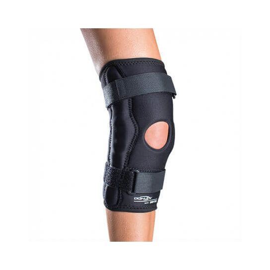 The Donjoy Drytex Economy Hinged Knee Brace is available in both a regular pull-on sleeve for compression and a wrap-around style for easier application. It can also be ordered with a popliteal cutout behind the knee where the brace material has been removed in an oval cutout to reduce the bunching up of material during use.