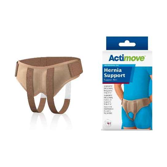 The Actimove Hernia Support Belt - Single or double hernia support, wearable over undergarments. Helps to relieve pain as specially designed pressure pads provide targeted support to reduce inguinal hernias. Suitable for single or double hernias thanks to the removable right and left pads. Flexible, removable foam cushions designed to provide gentle, comfortable compression on the hernias. Easily adjustable for desired compression and fit thanks to its elastic waist band. For patient comfort, can be worn on top of underwear. For more comfort, adjustable design without metal buckles, nor snaps. For skin comfort, made with a soft, plush lining. For individual fit, made with adjustable leg straps. Inconspicuous wear under most clothing thanks to its neutral beige color. Suitable for those sensitive to latex, as this product is not made with natural rubber latex. Easy hygiene, hand, or machine washable in cold water with mild soap. The product is intended to provide adjustable compression to inguinal hernias. Fields of application include: Reducible single or double inguinal hernias.